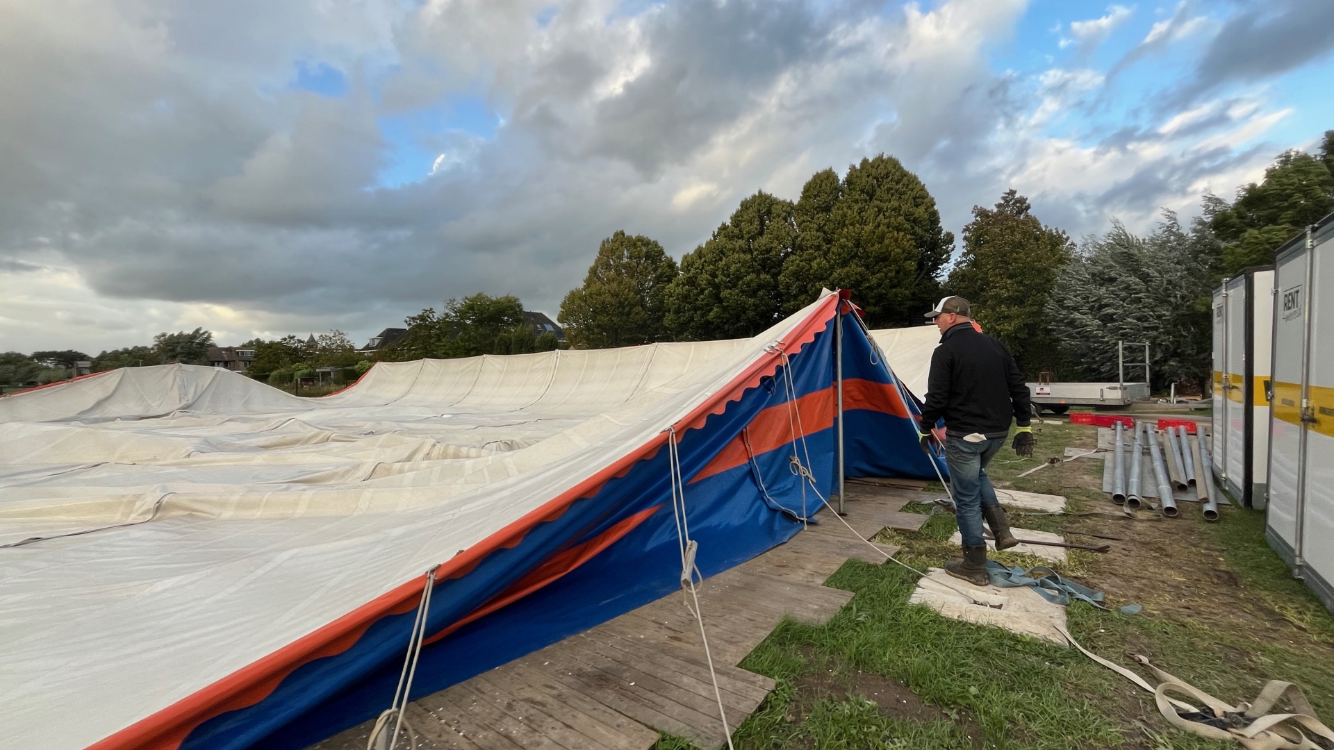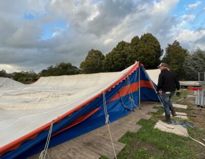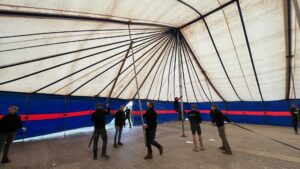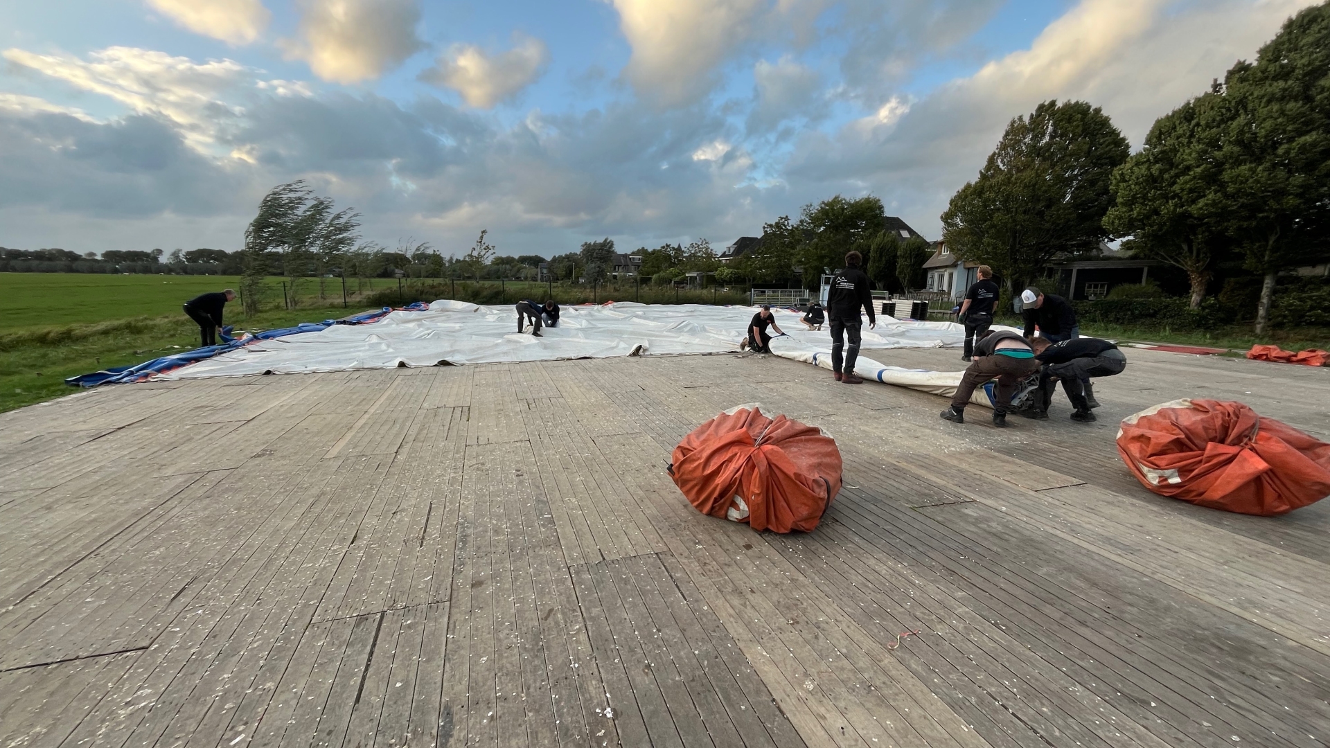 We gaan maandag vol goede moed en met veel plezier verder met bouwen om er voor jullie een mooie week met veel gezelligheid in de tent van te maken!